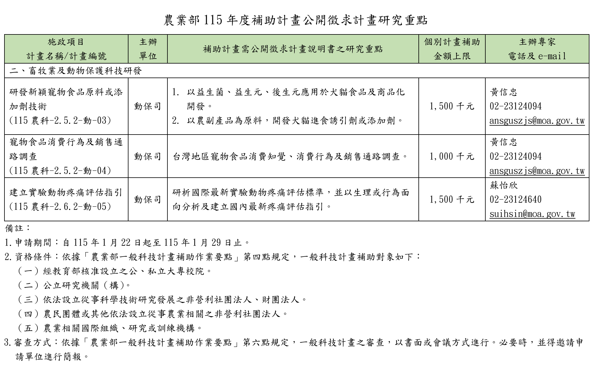 徵求計畫研究重點詳如下,擬申請計畫之研究人員請至農業計畫管理系統(網址:https://project.moa.gov.tw)撰擬計畫說明書,並依限(115年1月29日)將計畫說明書紙本掛號郵寄(以郵戳為憑)計畫主辦單位(註明收件之主辦專家),逾期不予受理,前述資訊同步公告於該部官網(首頁>最新消息)。